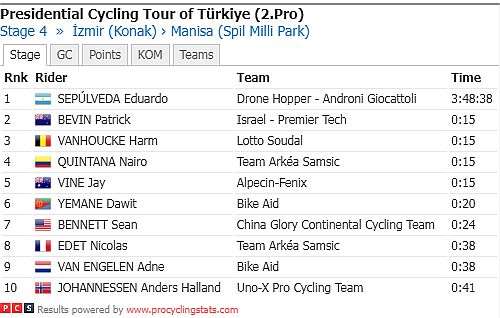 Así, Sepúlveda hizo su entrada triunfal en solitario y alzó los brazos en Spil Milli Park, quedándose con una gran victoria. El argentino aventajó 15″ al grupo perseguidor, donde arribaron Bevin, Vanhoucke, Quintana y Vine, valiéndole para asumir el liderato de la clasificación general.