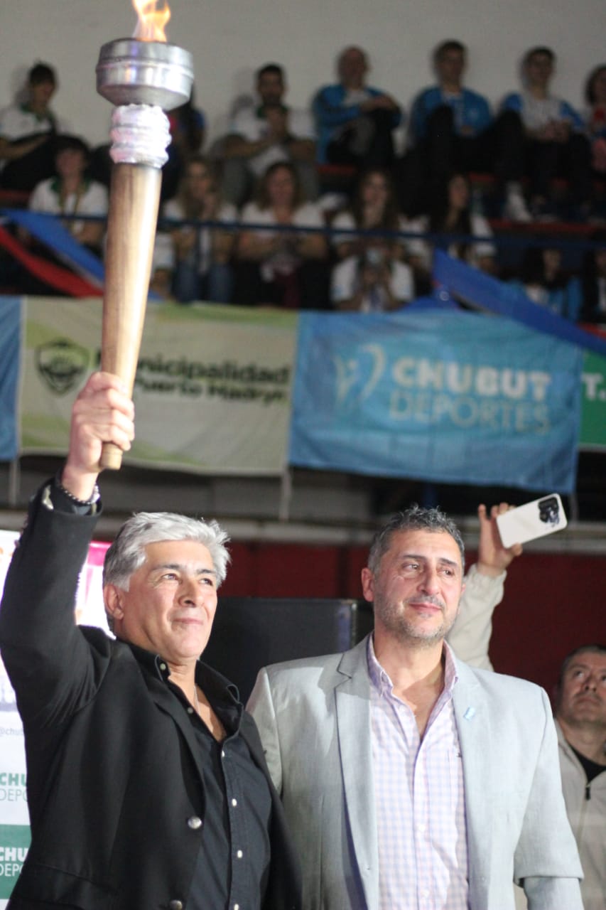 En el tramo final del acto, llegó el momento de la antorcha olímpica, el símbolo de los juegos, que estuvo a cargo de Julio César Calvo, ex combatiente de Malvinas y una leyenda del deporte regional. Futbolista consagrado que defendió colores de varios clubes de la región y que fue convocado bajo el lema de «A nuestros chicos de Malvinas, que nunca olvidaremos». Él fue quien además coronó el ritual del encendido del pebetero, el cual dejó formalmente inaugurado este evento deportivo y de integración.