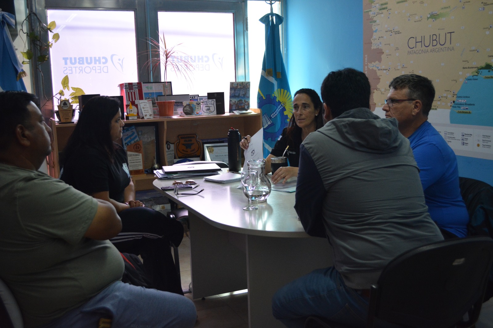 La profesora Alejandra Ibrahim, integrante del directorio de Chubut Deportes, recibió a Diana Milla Vejas, secretaria de la Liga, y a Darío Ñancu, delegado, junto al acompañamiento del concejal Juan Flores Revillot y el Director de Deportes de la Municipalidad de Rawson, Gastón Williams.
