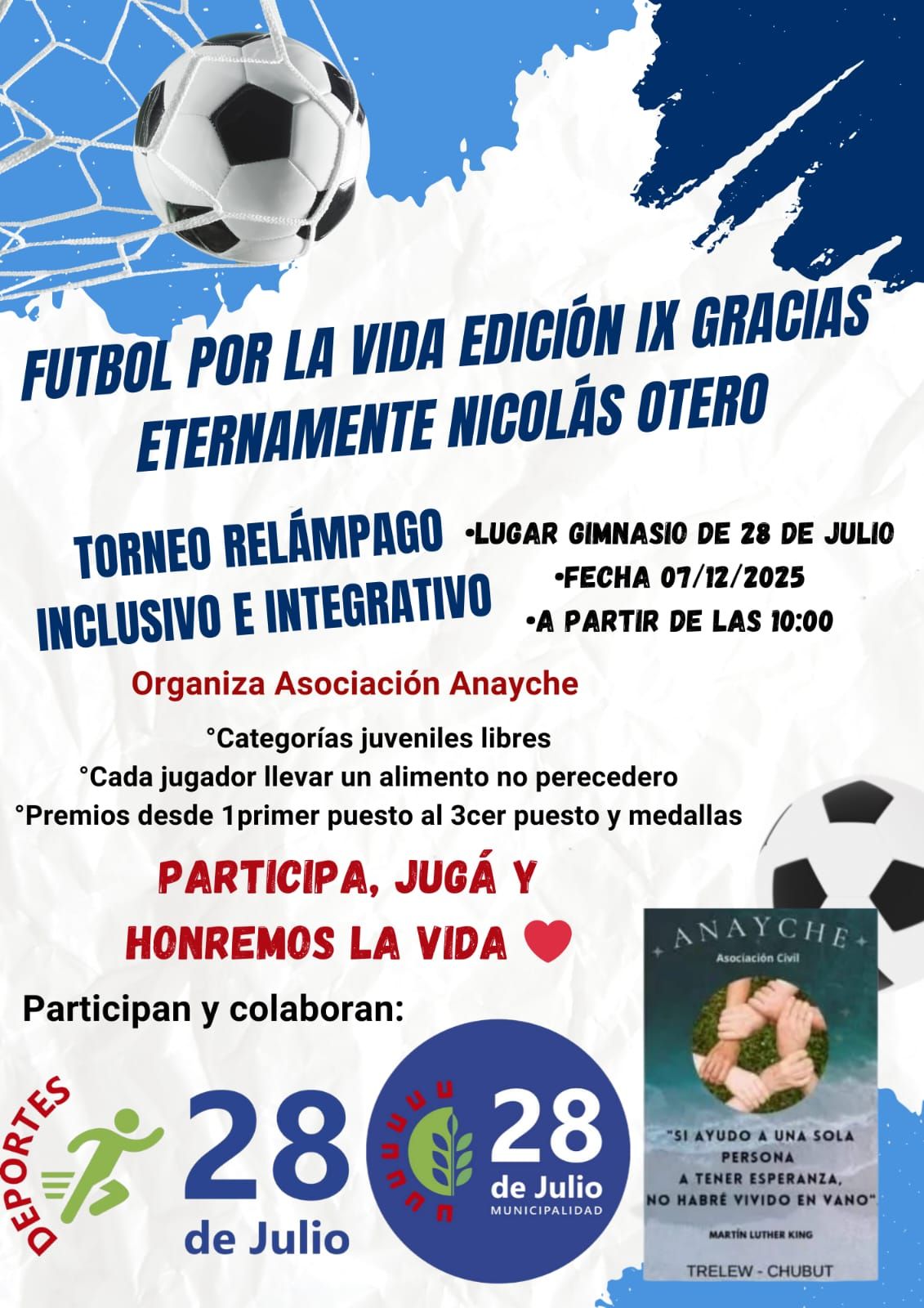 El próximo domingo 7 de diciembre, en el Gimnasio de la localidad de 28 de Julio, se llevará adelante la 9ª edición del Torneo relámpago “Futbol por la Vida”, denominado en esta oportunidad, “Gracias eternamente, Nicolás Otero”.