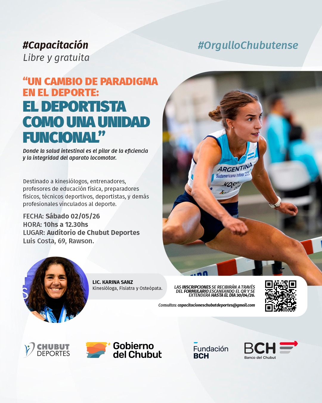 La capacitación que será de carácter libre y gratuita, se realizará el sábado 2 de mayo en el Auditorio de Chubut Deportes, y estará destinada a kinesiólogos, entrenadores, profesores de educación física, preparadores físicos, técnicos deportivos y demás profesionales vinculados al deporte.